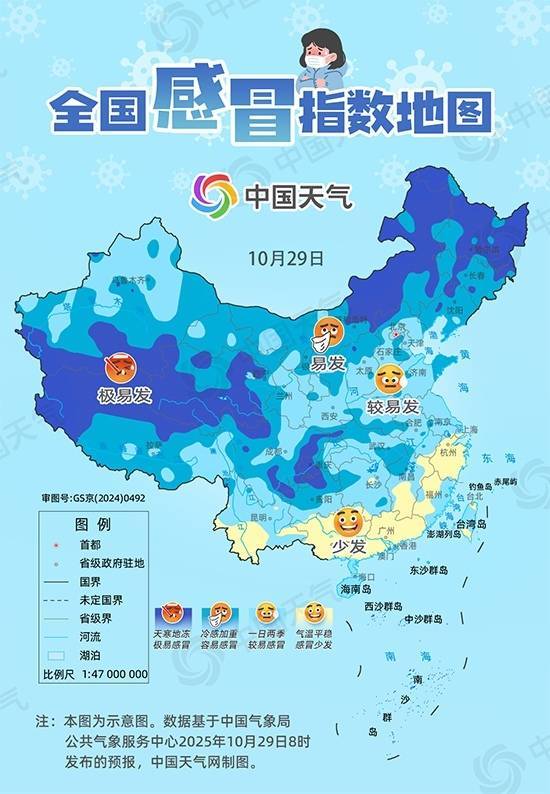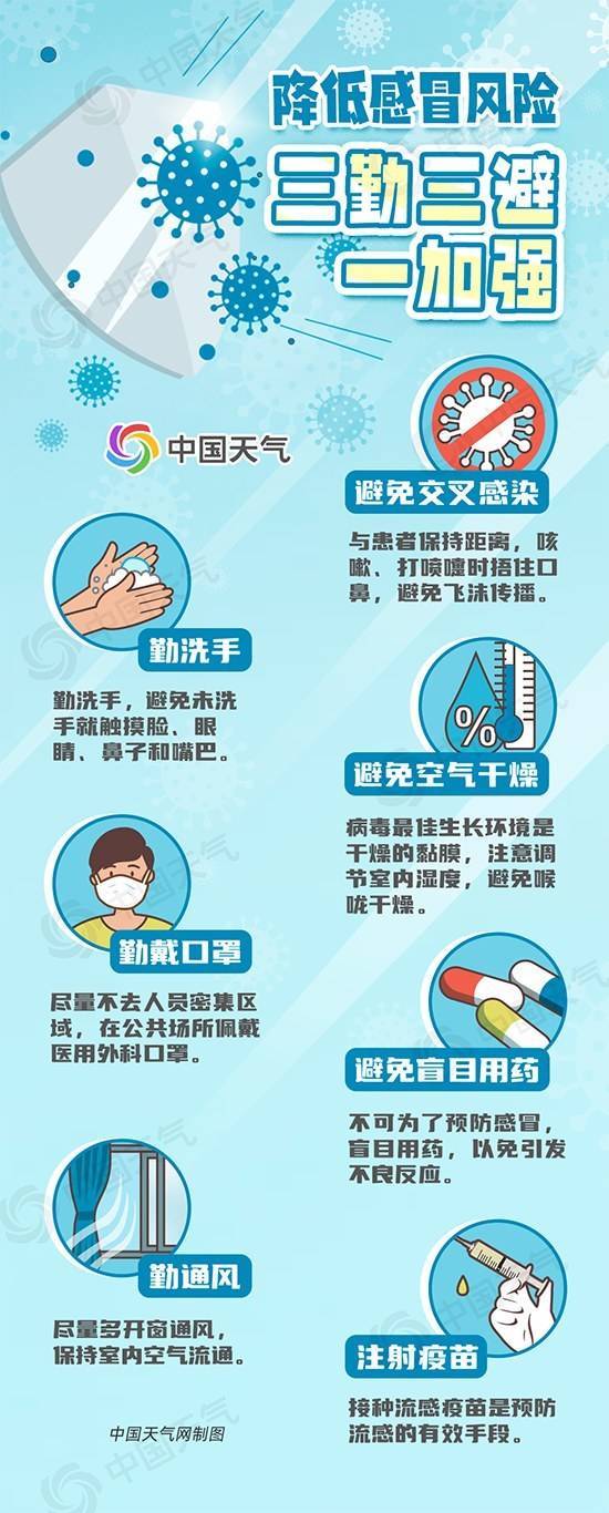 r时值霜降时节,正是秋冬季温差最大的时期。加上近期冷空气活动频繁,气温起伏明显,流感病毒传播趋于活跃,感冒风险显著上升。如何科学预防感冒?中国天气网总结了“三勤三避一加强”防御口诀,帮你筑牢健康防线。